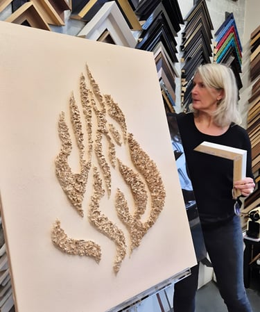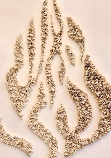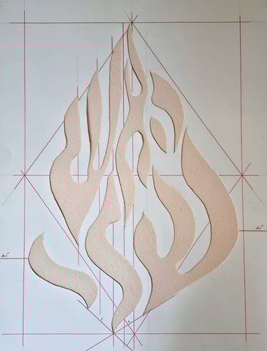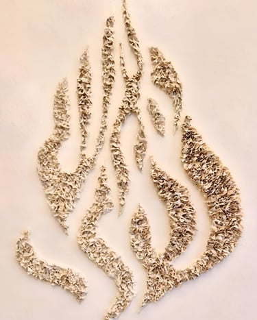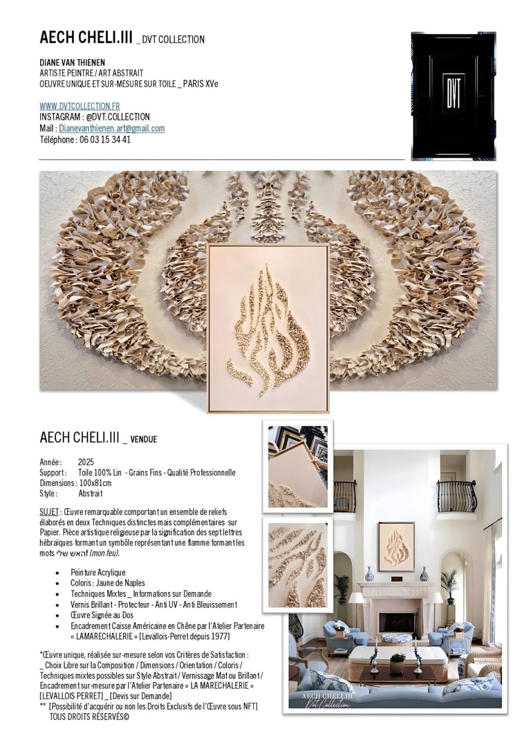 ▪︎ SUJET : Œuvre remarquable, unique par les Techniques inédites utilisées. Pièce de caractère, a portée religieuse par la signification des sept lettres hébraïques « inscrites », formant un symbole représentant une flamme dont chaque flammèche est une lettre juive, formant les mots האש שליf (mon feu).