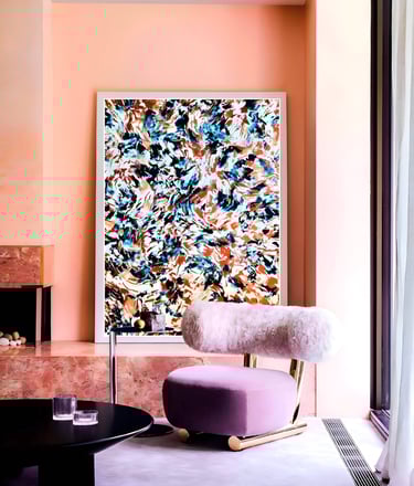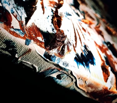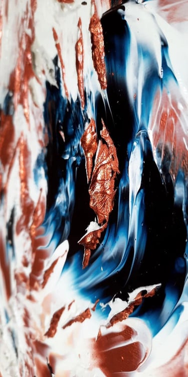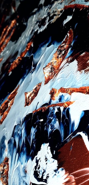 ▪︎ SUJET : Œuvre remarquable, de caractère, lumineuse. Pleine de mouvements aléatoires mais cohérents, L'idée ici est inspirée de la photographie ci bas, un ensemble montagneux cuivrés. Pour plus de subtilité, d'harmonie maligne de fins Copeaux Cuivrés ont été disposés sur les sommets les plus hauts. Pièce coup de Cœur!