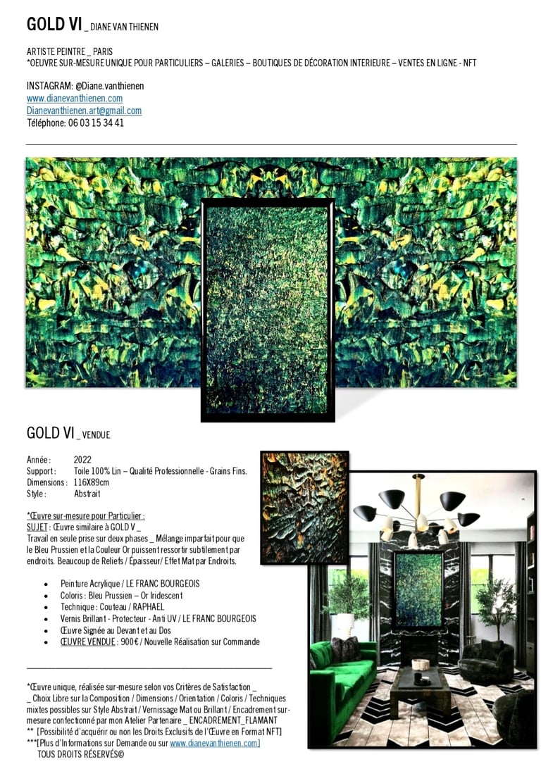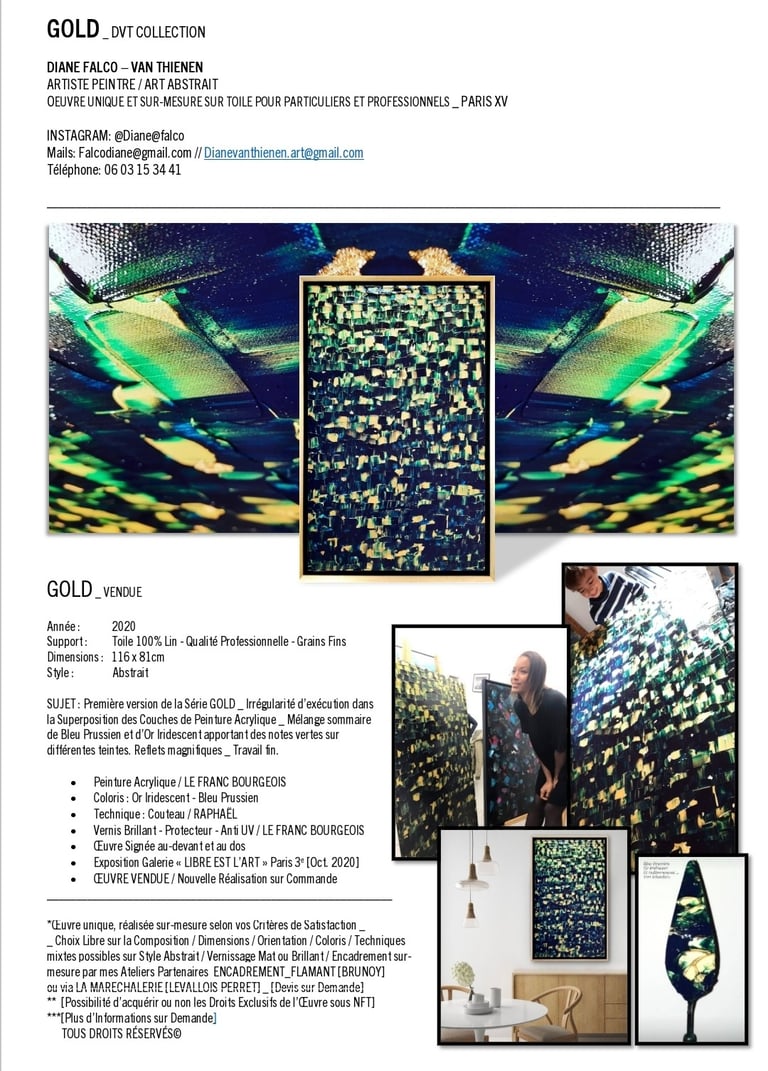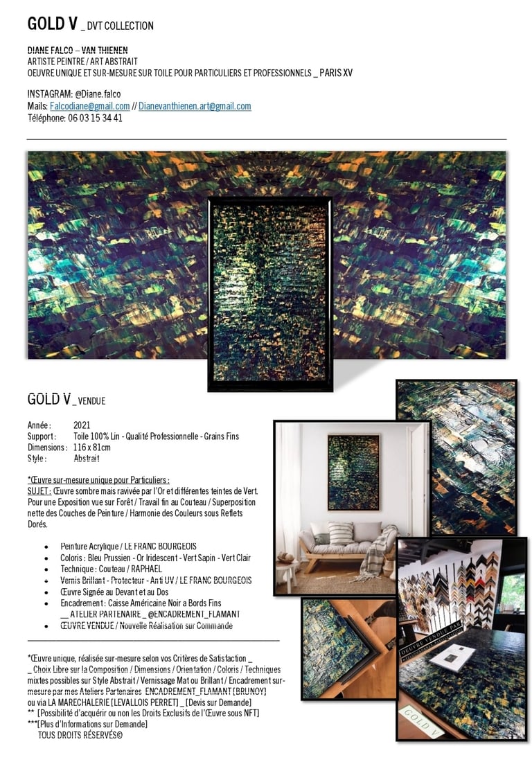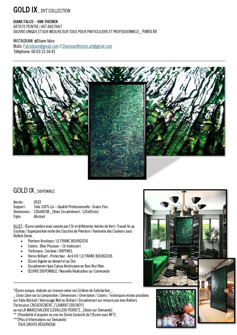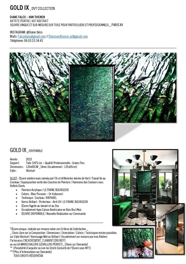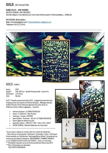▪︎ SUJET : La Série GOLD acquiert des Oeuvres a tons sombres mais sont toutes révélées par différentes teintes vertes notamment grâce a l'apport d'Or Iridescent. Pièces uniques, le rendu de chacune est puissamment contemporain. Toutes travaillées au Couteau, ces pièces majeures se distinguent majestueusement les unes des autres alors qu'elles sont de même composition. Hormis GOLD IX [Collection Privee], certaines pièces se sont vendus directement après leur conception car réalisées sur-mesure pour Particuliers - Clients de la Marque DVT COLLECTION, tandis que d'autres se sont vendues grâce à des Galeries Partenaires [YELLOWKORNER et GALERIE LIBRE EST L'ART - Paris 3e _ Informations sur Demande].
