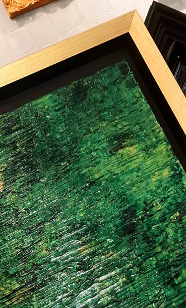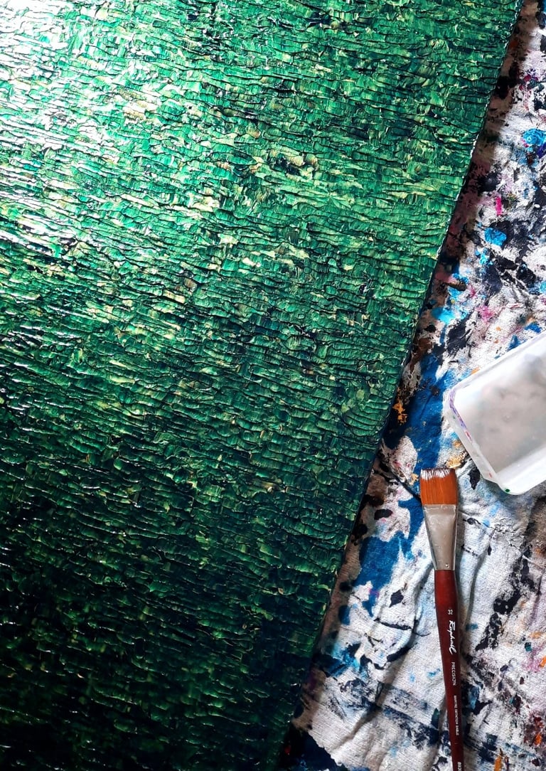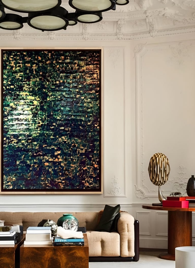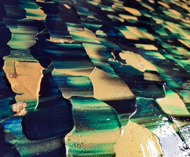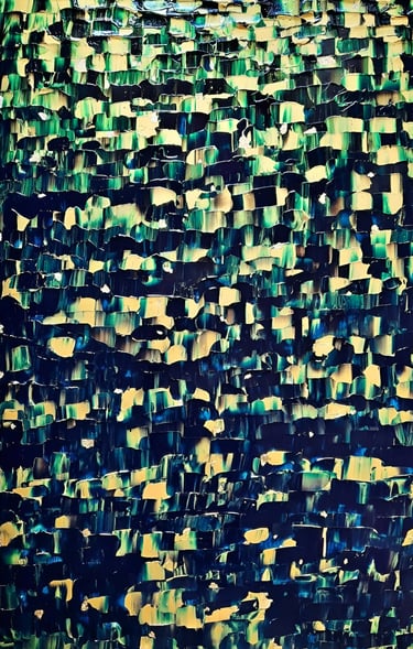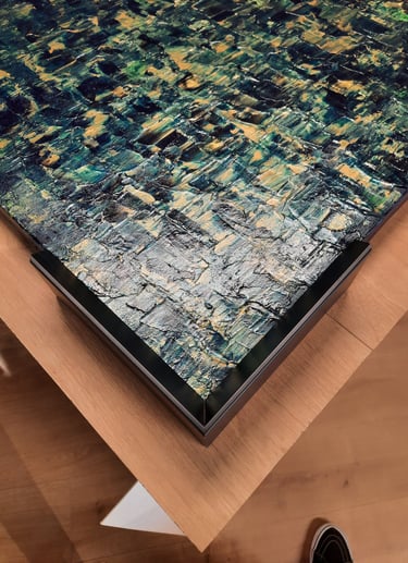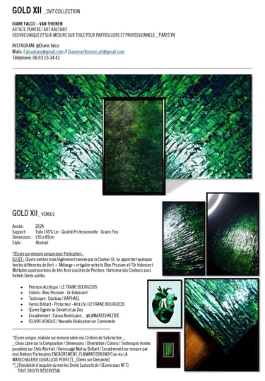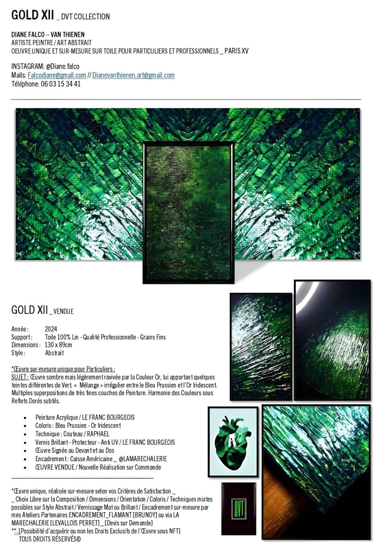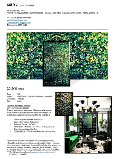 ▪︎ SUJET : La Série GOLD acquiert des Oeuvres a tons sombres mais sont toutes révélées par différentes teintes vertes notamment grâce a l'apport d'Or Iridescent. Pièces uniques, le rendu de chacune est puissamment contemporain. Toutes travaillées au Couteau, ces pièces majeures se distinguent majestueusement les unes des autres alors qu'elles sont de même composition. Hormis GOLD IX [Collection Privee], certaines pièces se sont vendus directement après leur conception car réalisées sur-mesure pour Particuliers - Clients de la Marque DVT COLLECTION, tandis que d'autres se sont vendues grâce à des Galeries Partenaires [YELLOWKORNER et GALERIE LIBRE EST L'ART - Paris 3e _ Informations sur Demande].