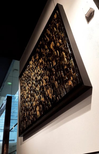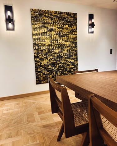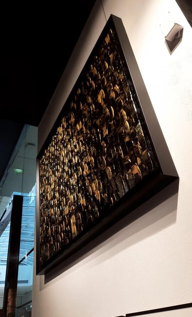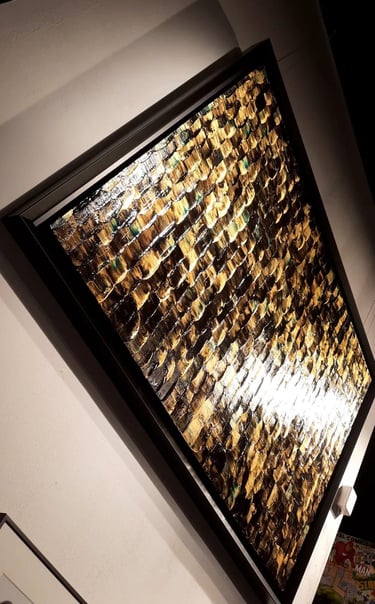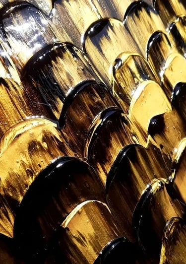 ▪︎ SUJET : Œuvres conçues en forts reliefs, composées en moyenne de 600 Nappes de Peinture Acrylique épaisses alignées, sans écart de mesure dans un joli mélange de teintes noires et dorées. Points forts : Symétrie, Parallélisme et Harmonie des Couleurs.