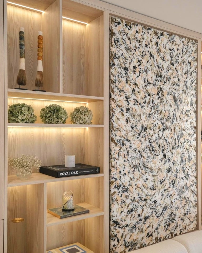 L'œuvre BRONZE est bien LA pièce majeure de cette rénovation. Encastrée de maniere magistrale au sein d'une Bibliothèque , l'ensemble des matières et éléments composants de cette décoration de standing ont été basés sur les Coloris et le Caractère Terreux de cette Pièce.
