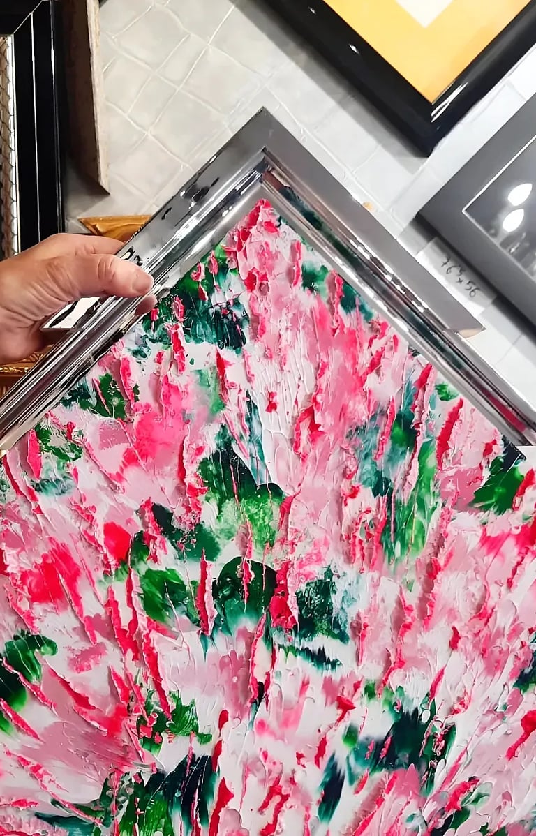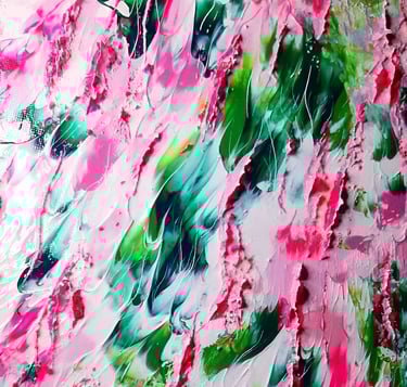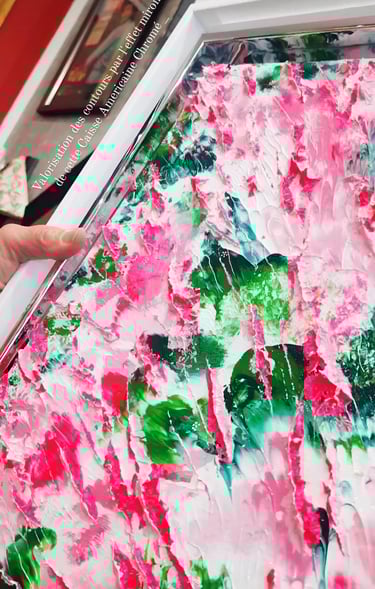 Conçue dans un véritablement esprit floral abstrait, comportant des Teintes rosées et vertes ainsi qu’un ensemble de Reliefs de toutes tailles. "CHARLOTTE" est une Oeuvre lumineuse, puissante, ravivée par de multiples mouvements, contrastes et Couleurs très énergisantes _ Travail fin. Œuvre remarquable.