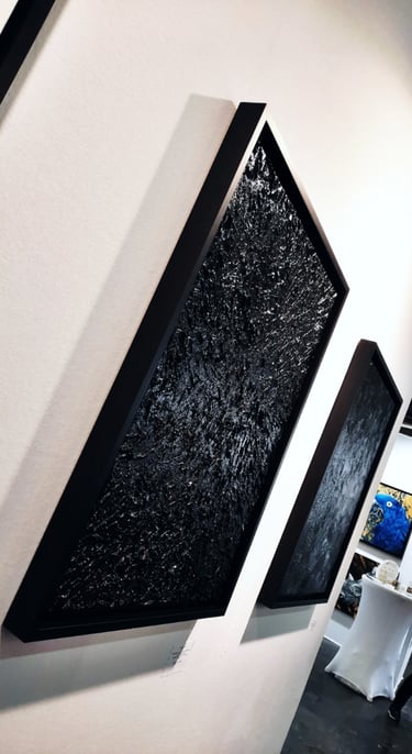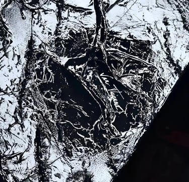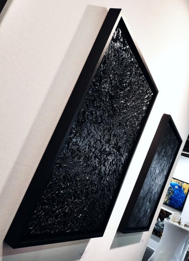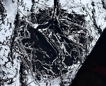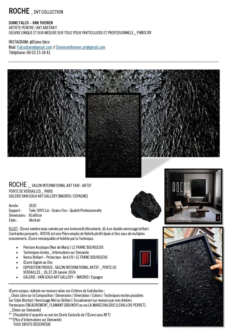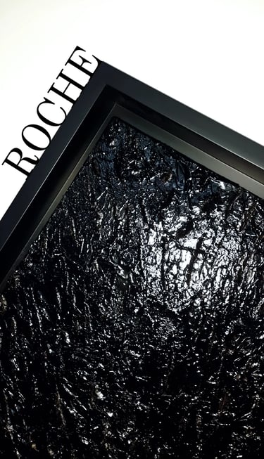 ▪︎ SUJET : Œuvre sombre mais ravivée par une luminosité étincelante, dû à un double vernissage brillant. Contrastes puissants ; ROCHE est une Pièce emplie de Reliefs plutôt épais et fins sous de multiples mouvements. Œuvre remarquable et Inédite par la Technique.