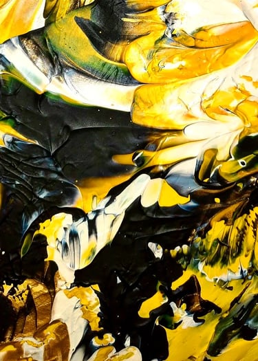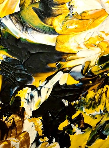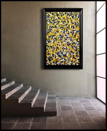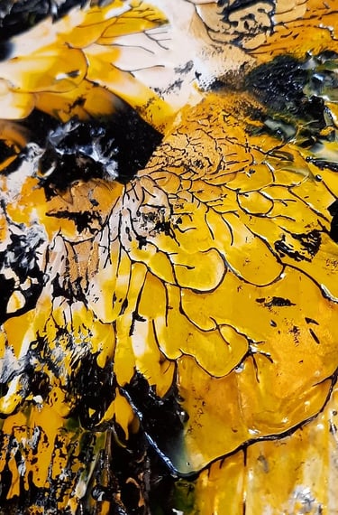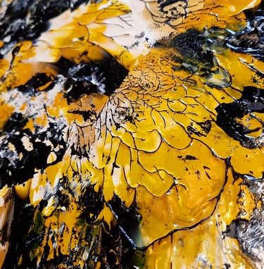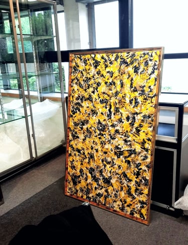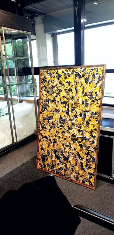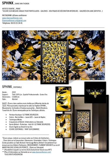 ▪︎ SUJET : Œuvre a tons sombres mais révélée par différentes teintes de Jaune. Pièce puissante, inspirée par les ailes du Papillon SPHINX . Mouvements, Contrastes et Couleurs puissantes Reliefs Bicolores. Travail très fin. Œuvre remarquable par les Techniques utilisées.