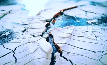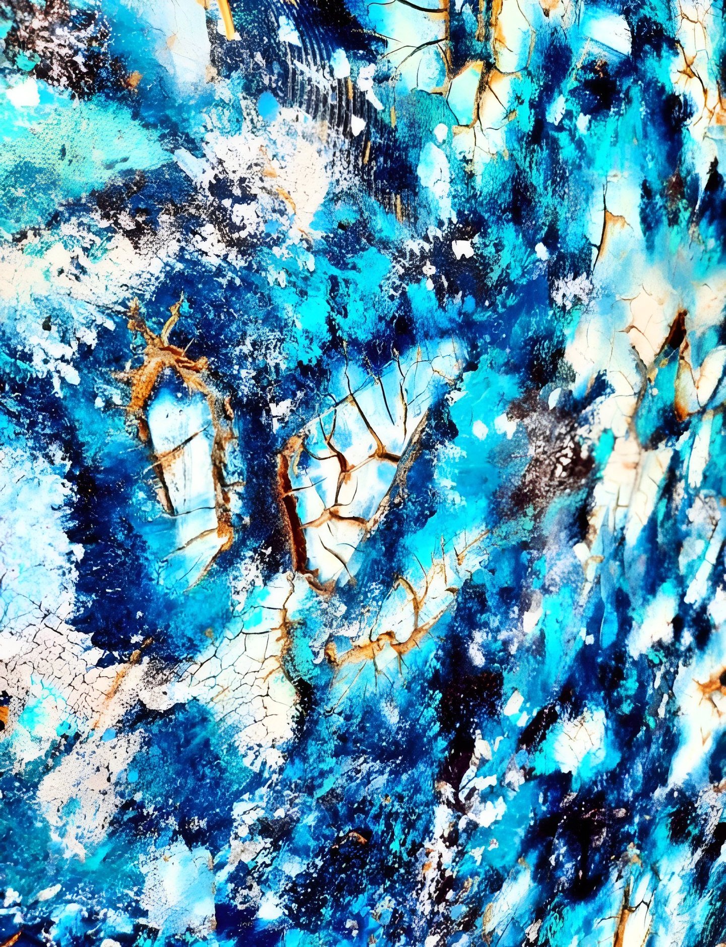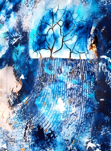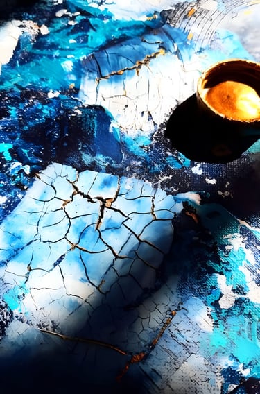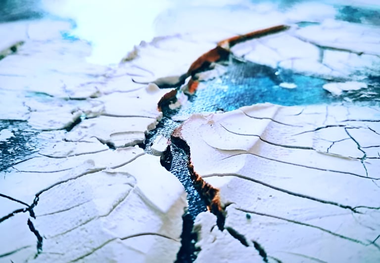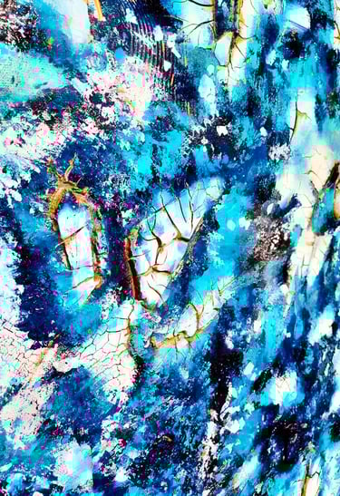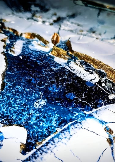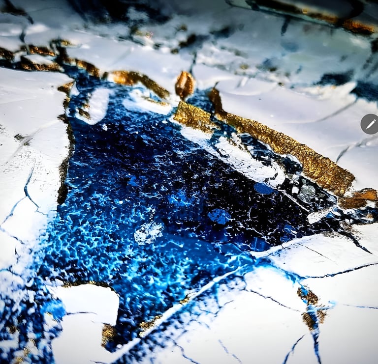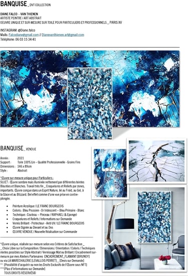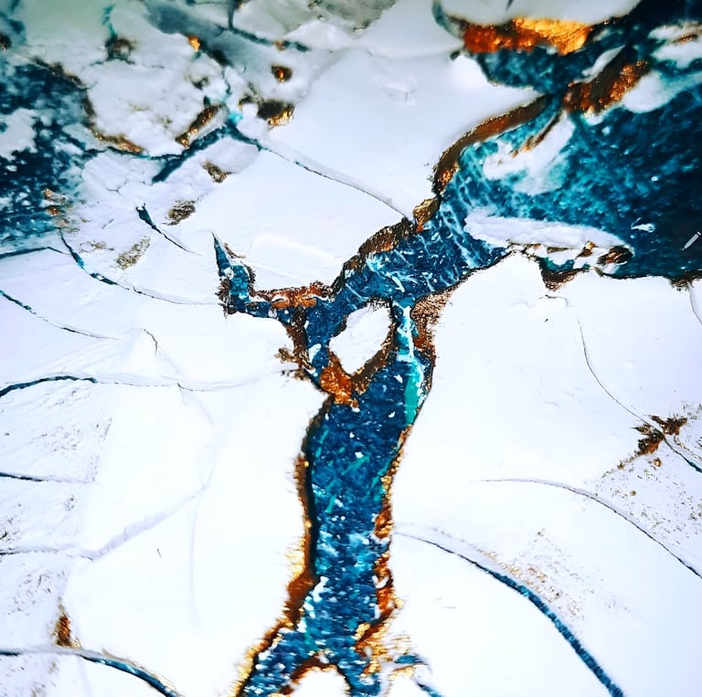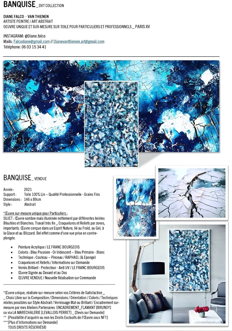 ▪︎ SUJET : On plonge dans l'univers glacé de "Banquise" : un tableau qui capture l'essence d'un paysage hivernal. Des touches de blanc, de bleu prussien et de turquoise, rehaussées par des accents dorés. Avec ses reliefs, ses craquelures, et ses vagues évoquant la glace et le givre, il offre une immersion dans la pureté et la puissance d’un monde gelé. Une invitation à ressentir la beauté brute des climats polaires.