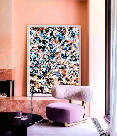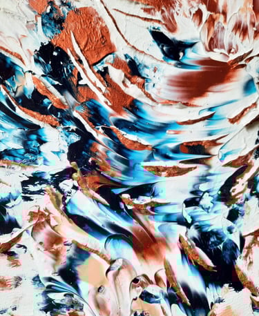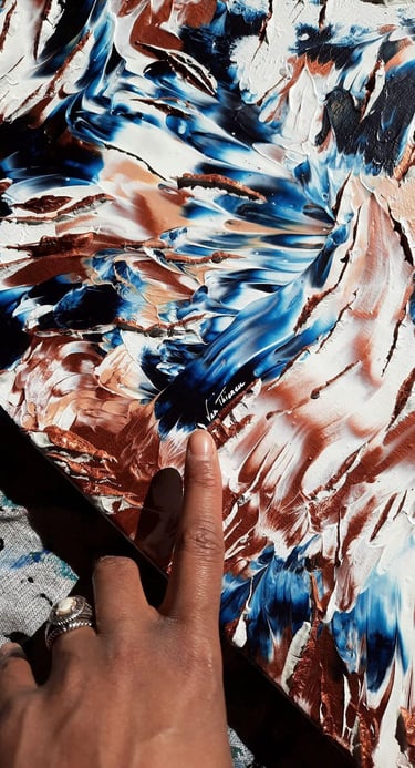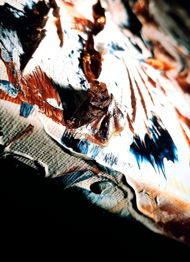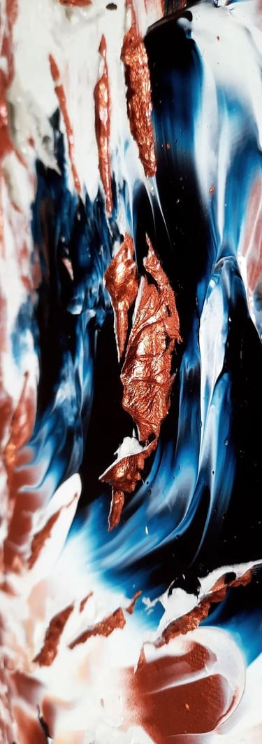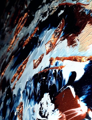 ▪︎ SUJET : Œuvre remarquable, de caractère, lumineuse. Pleine de mouvements aléatoires mais cohérents, L'idée ici est inspirée de la photographie ci bas, un ensemble montagneux cuivrés. Pour plus de subtilité, d'harmonie maligne de fins Copeaux Cuivrés ont été disposés sur les sommets les plus hauts. Pièce coup de Cœur!