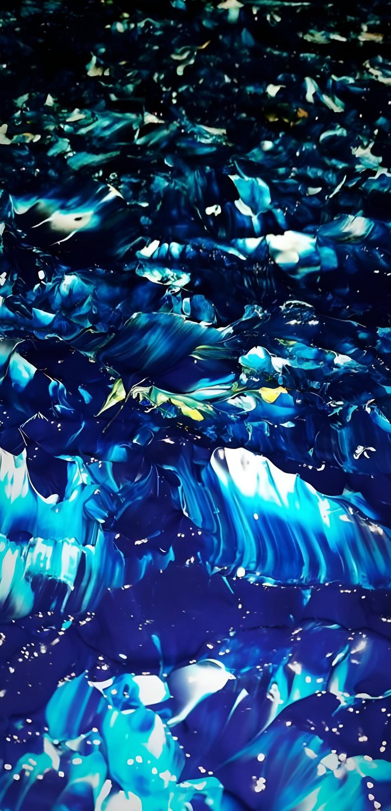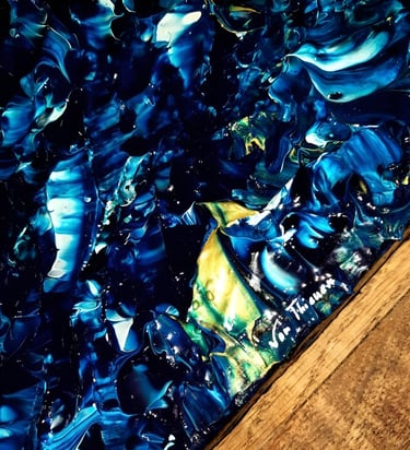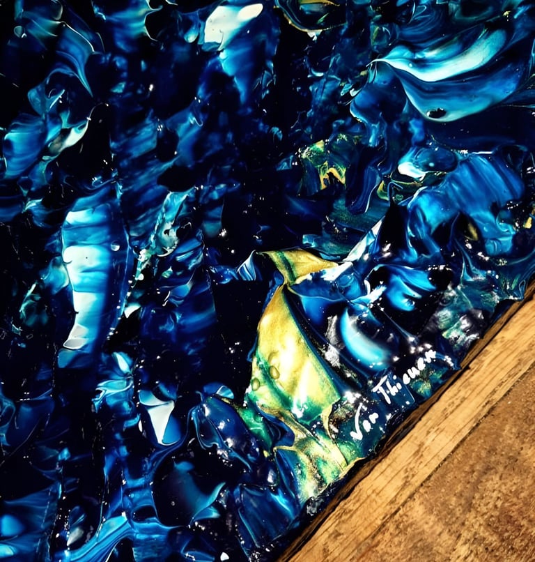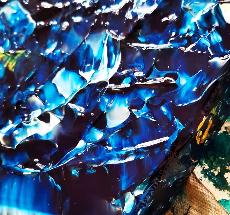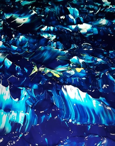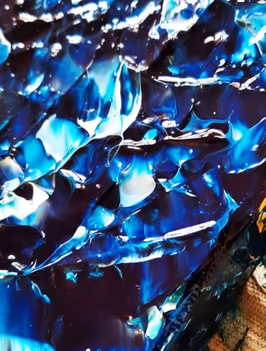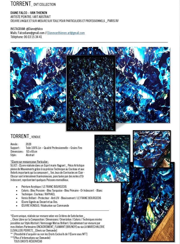 ▪︎ SUJET : "Ce tableau, intitulé 'Torrent', capture une mer en pleine incitation, dans un mouvement de puissance brute. Les contrastes saisissants entre les tons bleus prussiens, turquoise, blanc titane et les soupçons d’or évoquent la force des profondeurs marines. Chaque relief et chaque mouvement transportent le regard dans une tempête inévitable, où la nature se déchaîne avec élégance."